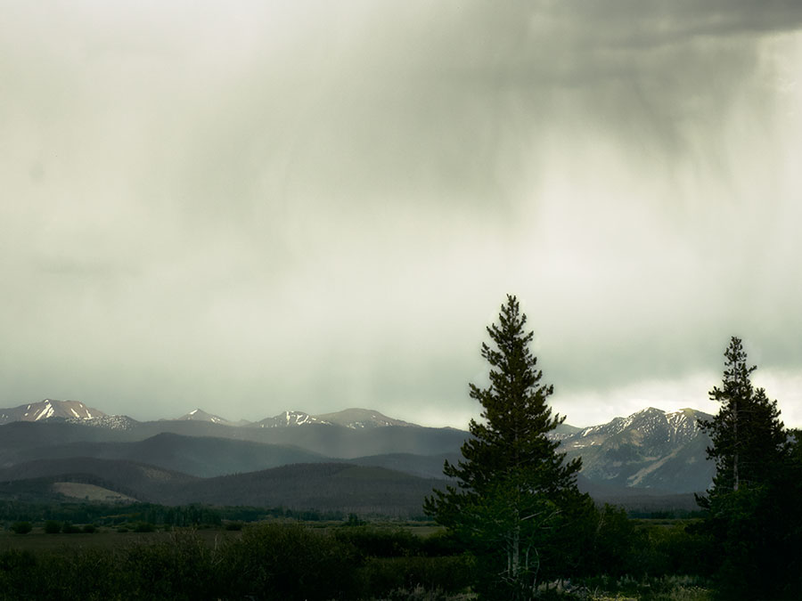 Beautiful layers of landscape and nicely framed by the storming clouds.
