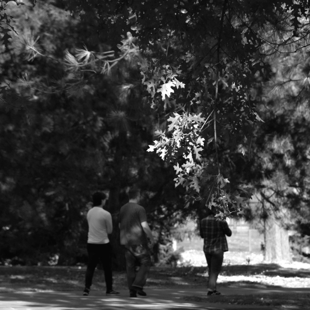 The highlights (leaves and light on middle figure) were adjusted in black and white post editing